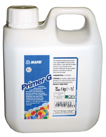 Primer G Priming is essential where absorption needs to be reduced on surfaces such as render, plywood, plaster, plasterboard and sand:cement screeds. Anhydrite screeds and gypsum plaster must be sealed before application of any cement based adhesives or failure may occur.