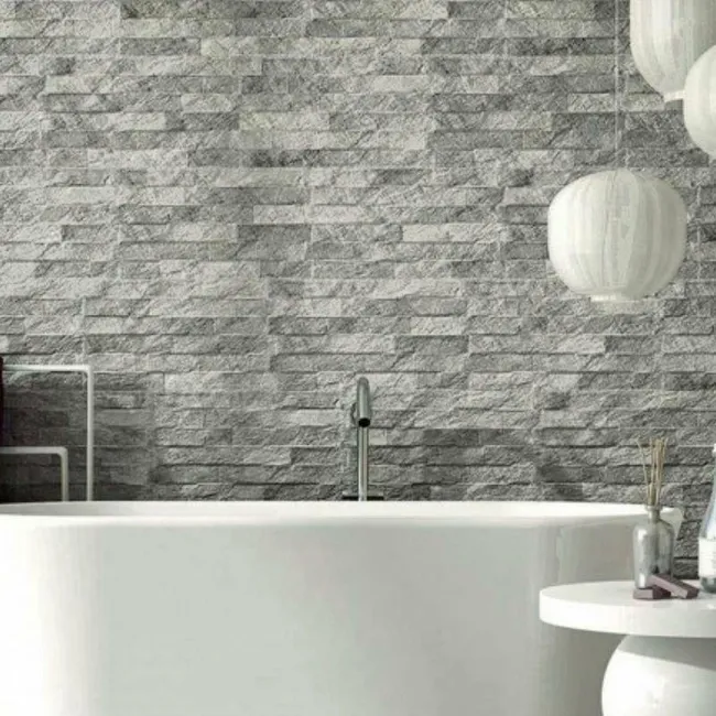 Enjoy the natural tones of slate with the Ribera grey slate effect tile, a beautifully natural slate effect tile designed to replicate a split-face mosaic in a singular tile. Ribera slate effect authentically reproduces the appearance of a natural split face mosaic, allowing you to enjoy a genuine natural stone aesthetic without the maintenance and upkeep required of natural stone. Interlocking panels with a depth of approximately 45mm mean that when installed these tiles are virtually indistinguishable from real stone walls, a trending look within interior and exterior design.