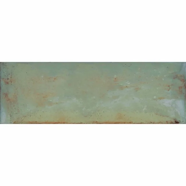 The Zellige Sage Green tile features a porcelain construction in a sage green colouring with warm rust-tone mottling for a rustic appearance, complemented by a traditional Zellige style bumpy gloss surface finish and 18 unique face designs, perfect for Moroccan style wall designs.